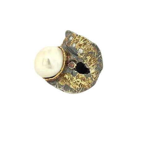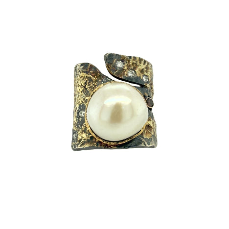 Regular price $3,360.00This distinctive pearl ring showcases a lustrous 13.5mm white baroque pearl as its centerpiece, set in oxidized sterling silver and 22K gold. Six brilliant white diamonds (.20 carats total) accent the pearl, while a warm sherry-toned diamond (.05 carats) adds subtle contrast. The sculptural band spans 1 inch at its widest point, gracefully tapering to a delicate 1/4 inch. An artisan creation in size 6, this singular piece merges organic pearl beauty with refined metalwork.