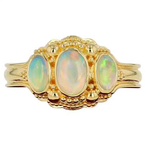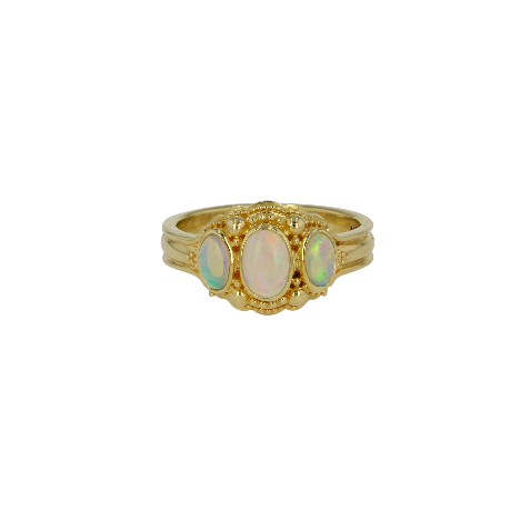Ring set with three beautifully matched opals totaling 0.39 carats, mounted in textured 18K yellow gold. Approximate ring size is 6 1/2.