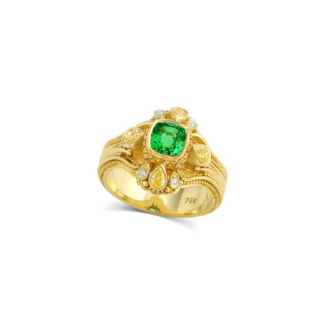 Regular price $13,000.00One-of-a-kind 18K yellow gold ring set with a rare cushion-shaped chrome tourmaline weighing 1.12 carats. It is further accented with yellow diamonds totaling 0.43 carats and white diamonds totaling 0.05 carats. The surface texture is created by granulation, an ancient and highly skilled decorative art form. Approximate size 7.